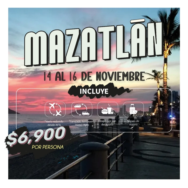A la hora acordada, cita en el (NLU) Aeropuerto Internacional Felipe Ángeles para tomar vuelo con destino a Mazatlán.
