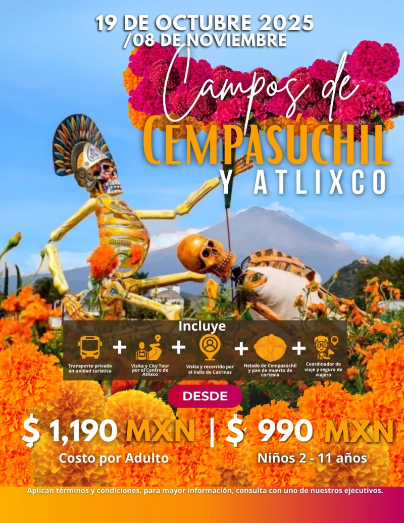 11:00 h. ¡Hemos llegado al pueblo mágico de Atlixco! Este pueblo mágico convive con el volcán Popocatépetl. Visitar Atlixco es una aventura aromática y multicolor. Este pueblo presume su abundancia y riqueza natural. Comenzaremos nuestro recorrido guiado por los hermosos campos de Cempasúchil, flor emblemática de Día de Muertos. Aquí, nos darán una breve explicación sobre la importancia, cuidados y usos de esta flor. Aprovecha este tiempo libre para tomarte muchas fotos en estos bonitos campos, seguir recorriendo por tu cuenta y llevar algún recuerdo.