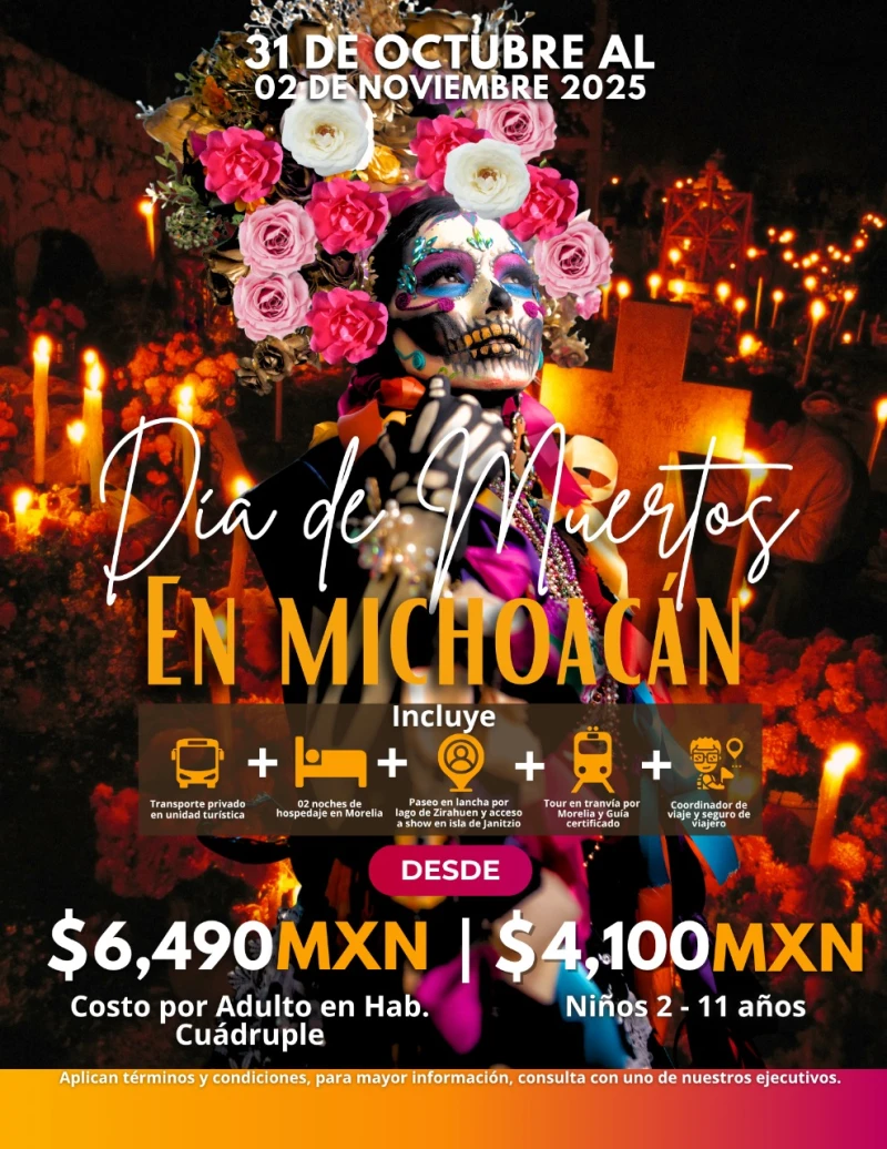 20:30 h. Te esperamos en el lobby del hotel para trasladarnos al Centro de Morelia y admirar las ofrendas y espectáculos que se ofrecen durante el día de muertos. También, visitaremos la catedral, recorreremos sus alegres calles y decoraciones. Aprovecha este tiempo libre para tomar increíbles fotos, cenar algo rico, seguir recorriendo y llevar algún recuerdo. Regreso al hotel por cuenta del pasajero.