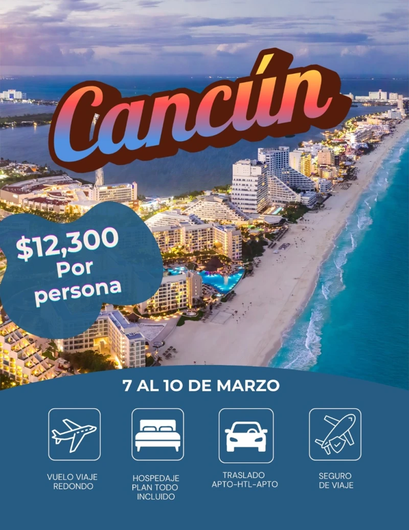 🏨 3 noches de hospedaje en Cancún en plan todo incluido (desayunos, comidas, cenas, botanas, bebidas).